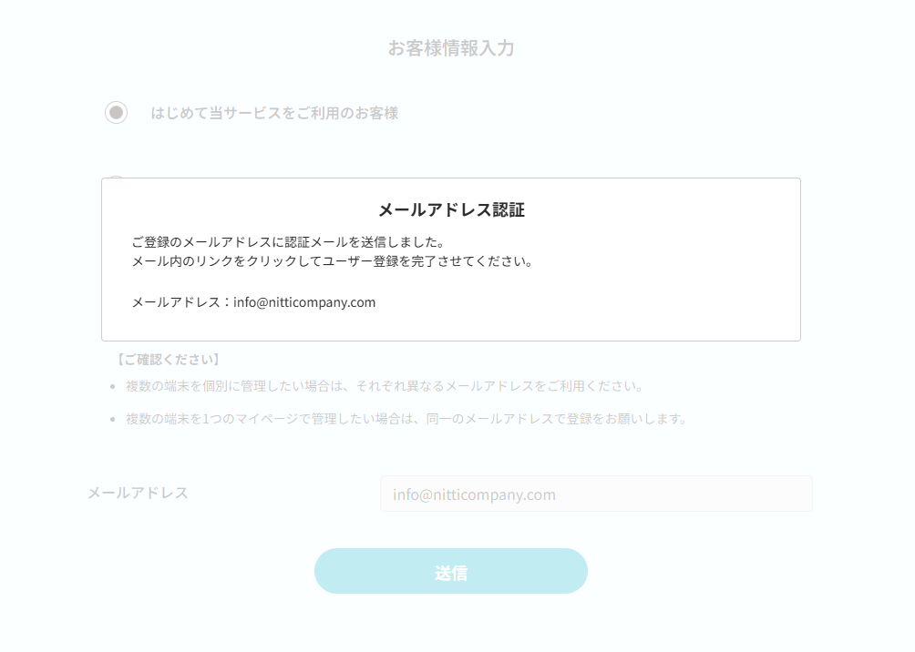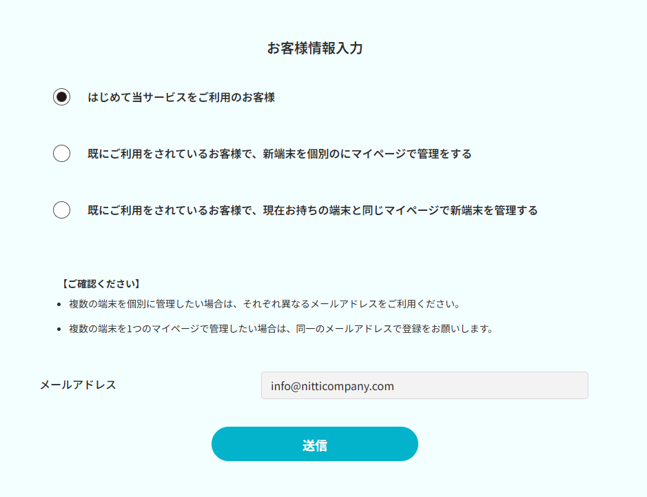 「はじめて当サービスをご利用のお客様」または「既にご利用中で、新しい端末を個別のにマイページで管理されるお客様」を選択された場合は、メールアドレスの入力が必要です。