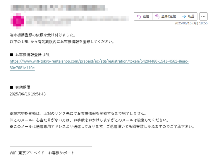 ④ 届いたメール内の「お客様情報登録URL」をクリックして、メールアドレスの認証を完了してください。